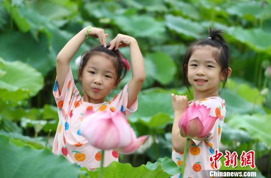 一对双胞胎姐妹在荷花前摆出各种pose。 刘占昆 摄