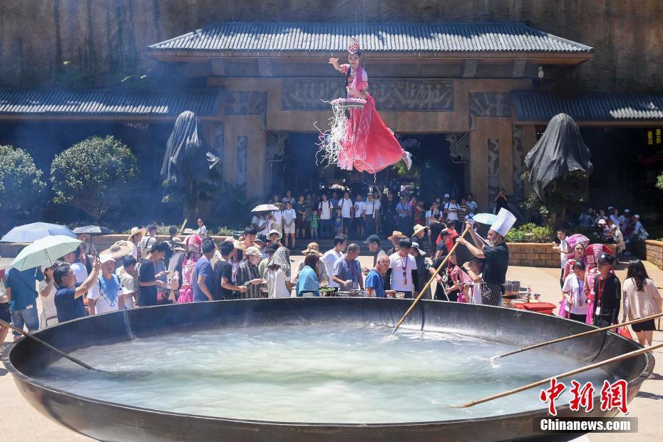 7月24日,广西桂林某景区支起了一口巨型铁锅,装扮成“刘三姐”的演员在10米高空向锅中下米粉,邀请游人免费品尝。据悉,这些米粉总重量近千斤,由桂林当地上好的早籼米制作而成,配上香味浓郁的卤水吸引了众人分食。 陈飞 摄