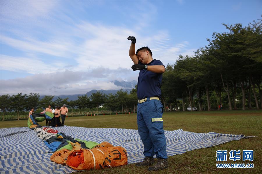 7月25日,在台湾台东鹿野高台,徐玉儒成功降落后与同事一起收拾球皮。新华社记者 吴鲁 摄