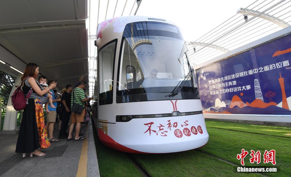 7月25日,一辆“不忘初心、牢记使命”主题有轨电车亮相广州新中轴线。图为市民、游客登上主题列车。中新社记者 姬东 摄
