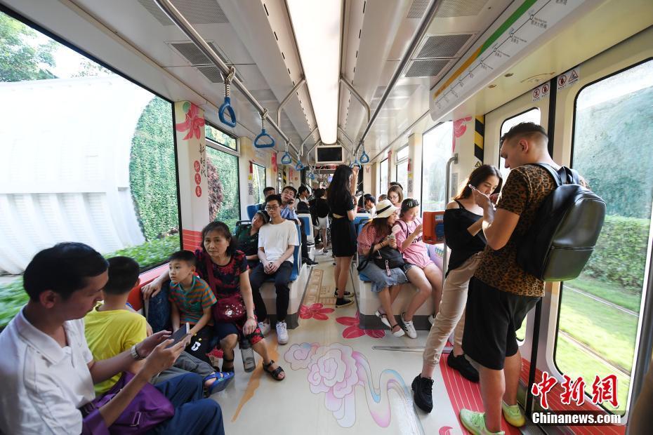 7月25日,一辆“不忘初心、牢记使命”主题有轨电车亮相广州新中轴线。图为市民、游客乘坐主题列车。中新社记者 姬东 摄