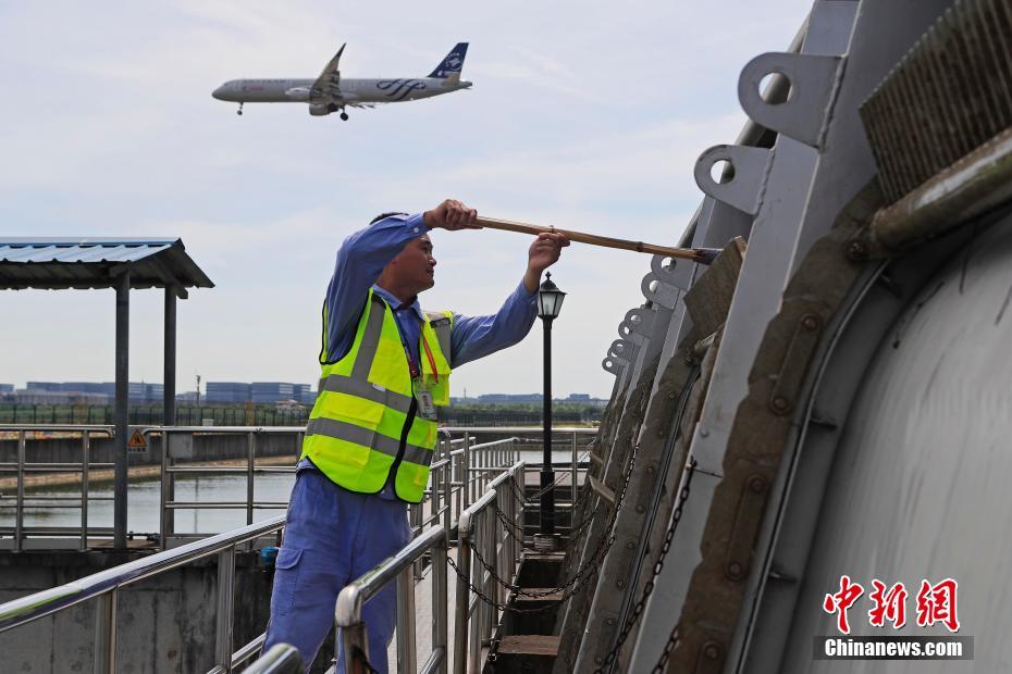 7月31日,虹桥机场工作人员正在清理护场河内的垃圾。近日,上海持续高温,工作在上海市虹桥和浦东两大机场停机坪上的员工冒着高温酷暑坚守岗位。中新社记者 殷立勤 摄