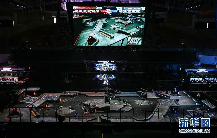 8月6日,北方工业大学和香港科技大学的队伍在比赛中。 当日,第十八届全国大学生机器人大赛机甲大师赛总决赛在广东深圳拉开帷幕,来自国内外的32支战队闯入总决赛,1000多名参赛队员将带着224台机器人在6天时间内争夺冠军。 新华社记者金宇摄