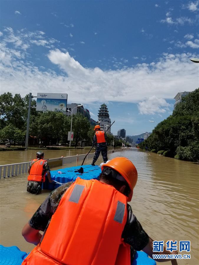 8月11日,在浙江省临海市,救援队员在运送浮桥。新华社记者 翁忻旸 摄