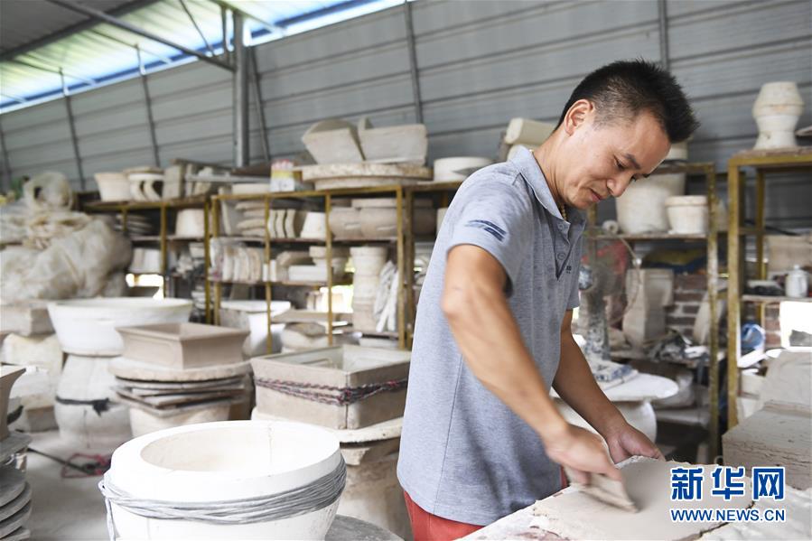 赵勇在自己创办的陶瓷制品加工厂内制作泥坯(8月11日摄)。