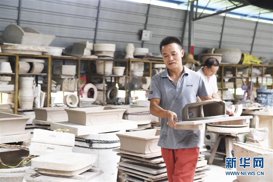 今年41岁的赵勇是广西桂平市社坡镇福和村的一名农民。2015年,在广东务工多年的赵勇携妻女返回福和村创办了一家小型陶瓷制品加工厂,主要制作手工花盆、花瓶、陶瓷桌椅等产品。