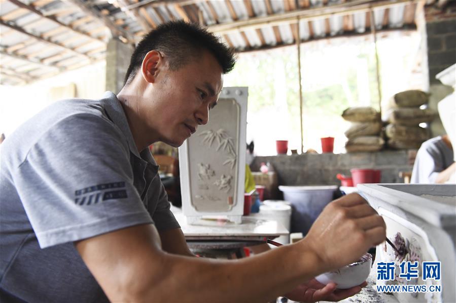 赵勇在自己创办的陶瓷制品加工厂内给陶瓷花瓶上色(8月11日摄)。 新华社记者 曹祎铭 摄
