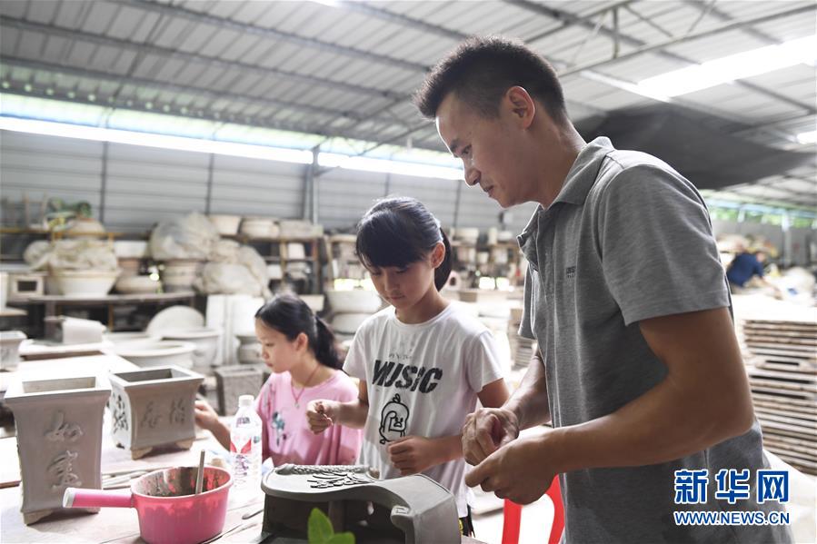 赵勇(右)在自己创办的陶瓷制品加工厂内教女儿(中)给陶瓷花瓶贴花(8月11日摄)。 新华社记者 曹祎铭 摄
