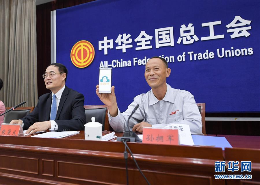 8月14日,上海交运集团股份有限公司下属机场物流中心驾驶员孙拥军(右)在发布会上展示 “司机之家”微信表情包图案。新华社记者 李贺 摄