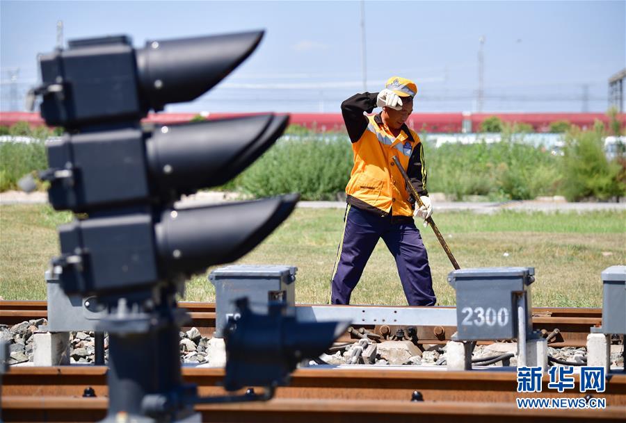连日来西安持续高温天气,在西安新筑车站,铁路工人顶着烈日坚守岗位,确保列车、钢轨运行状态良好。