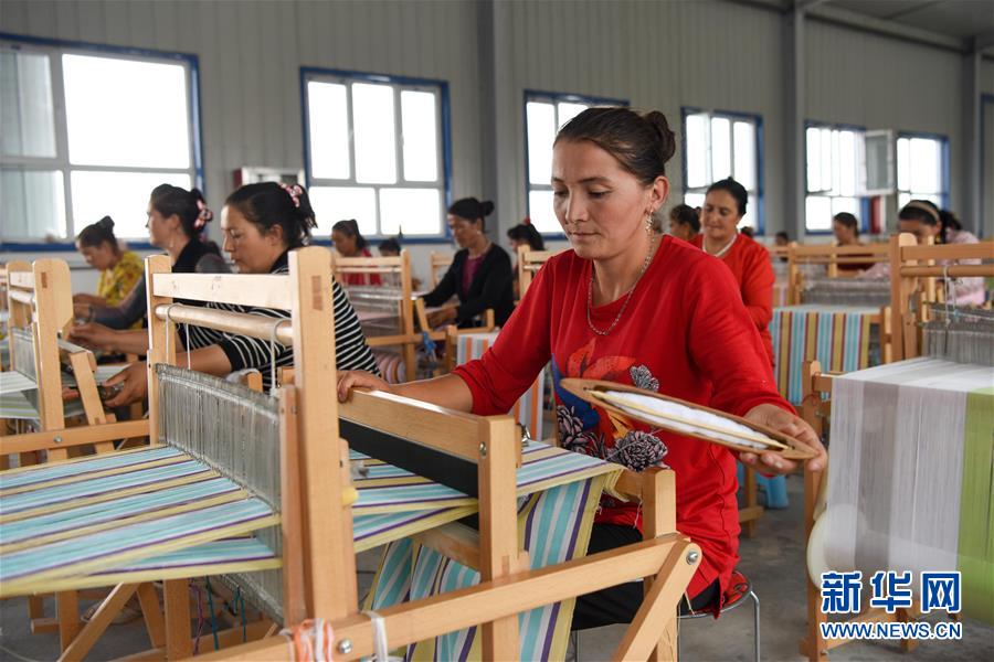 8月16日,在泽普县桐安乡德聚仁圣锦布艺有限公司,工人们在制作床单。 新华社记者 丁磊 摄