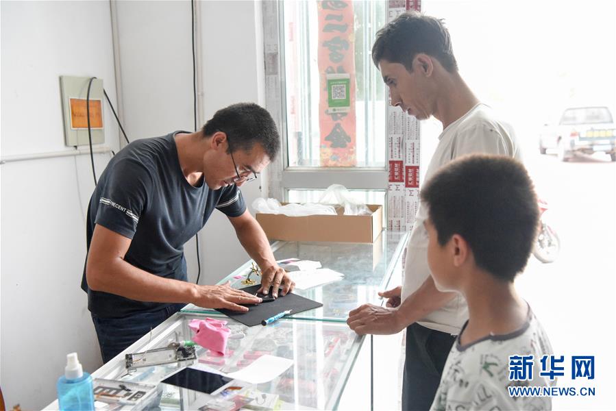 8月15日,居民在泽普县桐安乡的一家手机专卖店内维修手机。 新华社记者 丁磊 摄