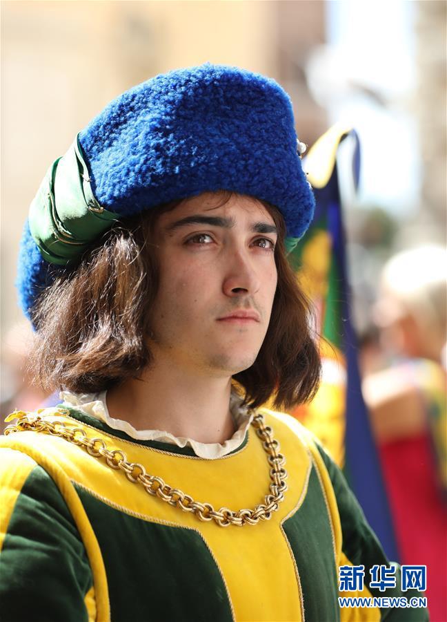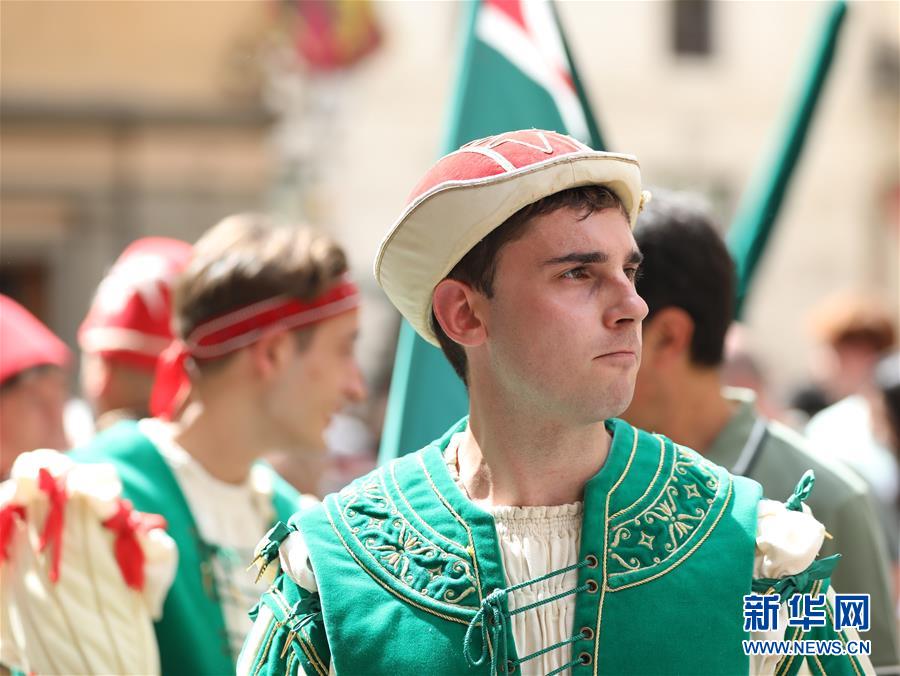 锡耶纳赛马节是世界闻名的意大利传统民间活动。赛马节期间,主办方还举行盛大的古装游行,吸引大量游客和当地人前来观看。新华社记者 程婷婷 摄