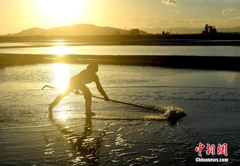 8月23日,福建省莆田盐场工人伴着落日余晖在盐池劳作。莆田盐场采用日晒制盐法,纯手工晒盐,盐场面积近10万公亩,年产海盐约9万吨,占福建省海盐总产量的三分之一。据史载,莆田盐场自元代即置场产盐,迄今已有700多年的盐业生产史。纳潮、制卤、扒盐、归坨、赶混……每一步工序都凝聚着一代代盐工的智慧。 中新社记者 吕明 摄