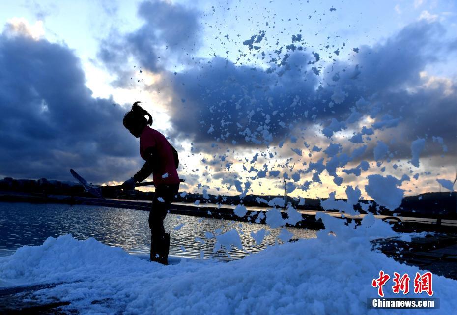 8月23日,朝阳刚刚升起,福建省莆田盐场的工人便开始了一天的劳作。莆田盐场采用日晒制盐法,纯手工晒盐,盐场面积近10万公亩,年产海盐约9万吨,占福建省海盐总产量的三分之一。据史载,莆田盐场自元代即置场产盐,迄今已有700多年的盐业生产史。纳潮、制卤、扒盐、归坨、赶混……每一步工序都凝聚着一代代盐工的智慧。图为工人将盐归坨。 中新社记者 吕明 摄