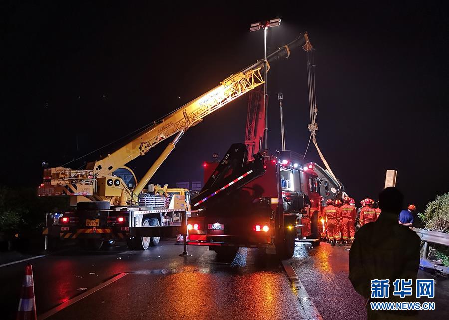 8月26日,救援人员在事故现场用吊车吊起侧翻的大巴车。当日0时许,一辆大巴车在广东阳江境内的沈海高速发生侧翻事故,目前已造成7人死亡。据介绍,该车由广州开往湛江市雷州方向,核载44人,实载47人,26日0时左右在沈海高速阳西段发生侧翻事故,现场导致6人死亡,1人送医后死亡,另有2人轻伤、9人轻微伤。具体事故原因目前正在调查中。 新华社发(阳江市阳西县应急管理局供图)