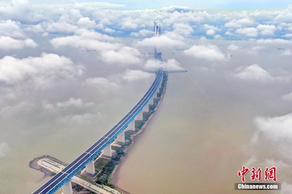 航拍沪通长江大桥 云雾缭绕呈现别样胜景
