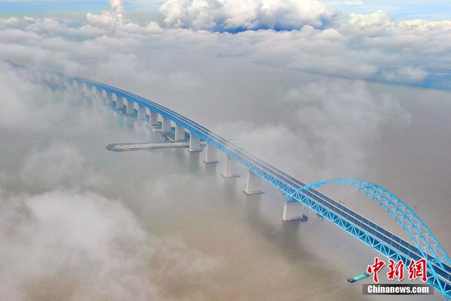 航拍沪通长江大桥 云雾缭绕呈现别样胜景