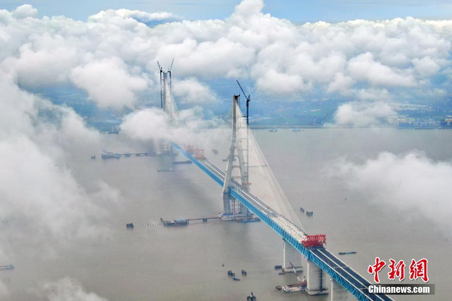航拍沪通长江大桥 云雾缭绕呈现别样胜景