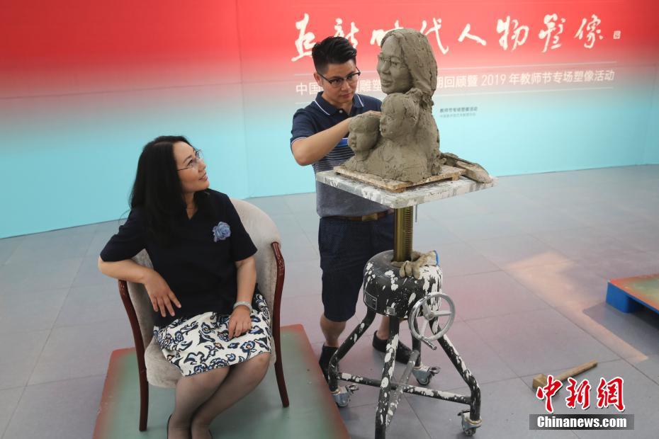 9月9日,“为新时代人物塑像:中国美术馆雕塑工作坊十期回顾暨2019年教师节专场塑像活动”在北京中国美术馆举行。“为新时代人物塑像”雕塑工作坊是中国美术馆近年推出的公共教育品牌项目,自2017年9月13日至2019年9月9日已举办十期。图为2019年教师节专场塑像活动现场,艺术家为北京市丰台区丰台第二幼儿园党委书记、园长游向红塑像。中新社记者 杜洋 摄