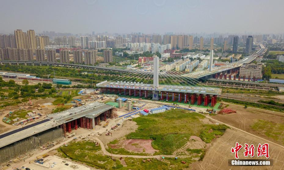 9月11日,长248米、重1.8万吨的武汉杨泗港快速通道青菱段斜拉桥在8号墩带动下,平稳地逆时针转体77度后,与此前一天旋转了105度、同等长度和重量的9号墩成功“牵手”。至此,这座世界上跨度最大、桥面最宽的转体斜拉桥基本建成。武汉杨泗港快速通道青菱斜拉桥是长江上首座双层公路——杨泗港长江大桥的重要配套工程。斜拉桥全长508米,标准宽度44米,最宽处达46米,是当今世界跨度最大、桥面最宽的转体桥,还是世界上首座独柱塔钢箱梁半漂浮体系转体斜拉桥。图为斜拉桥进行转体作业。 中新社记者 郑子颜 摄
