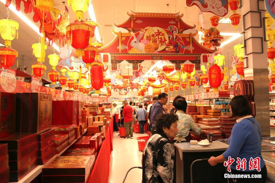 当地时间9月12日,中秋节来临之际,加拿大多伦多一家华人超市的“月饼街”颇为热闹,琳琅满目的各式月饼吸引顾客驻足选购。中新社记者 余瑞冬 摄