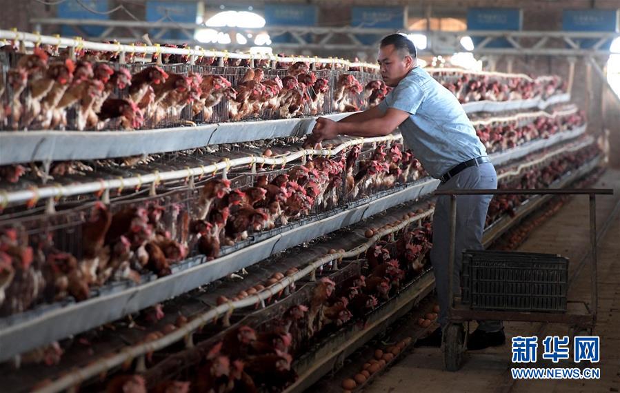 兰考县张庄村村民在自家养鸡场内收鸡蛋。摄于2019年9月。新华社记者 李安 摄