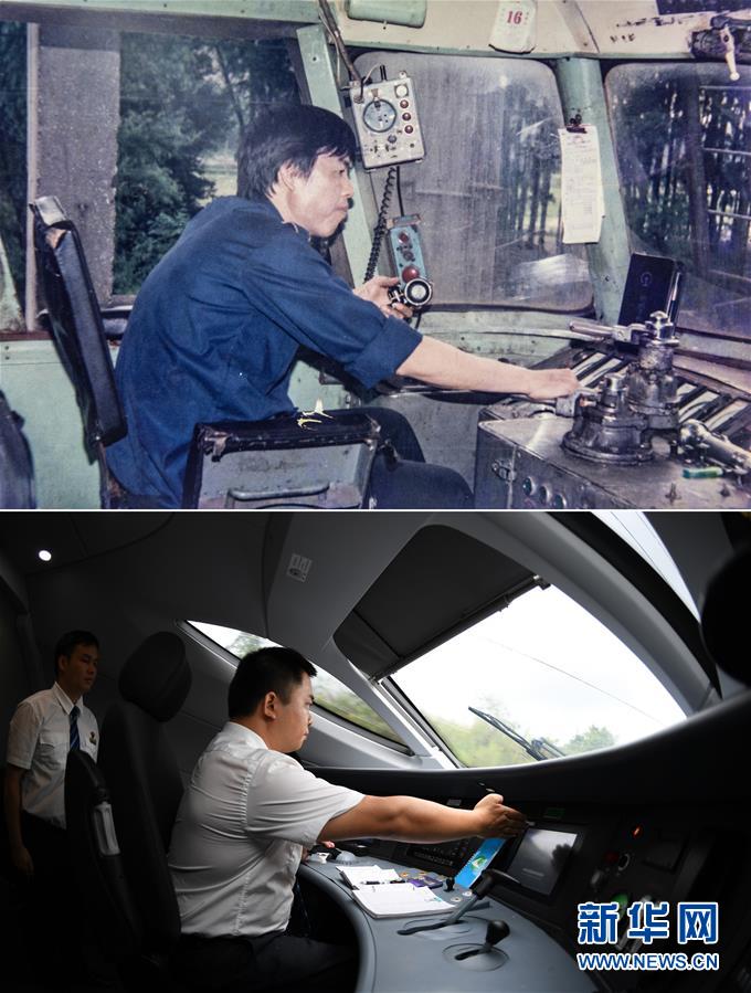 拼版照片:上图为1987年,一名火车司机驾驶内燃机车在广西境内行驶(中国铁路南宁局集团有限公司提供);下图为2018年6月26日,一名动车司机驾驶动车在广西南宁市境内行驶(新华社记者陆波岸摄)。