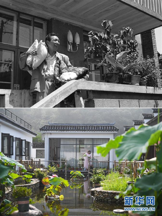 拼版照片:上图为1984年,在内蒙古呼和浩特,刘玉林在自家人开设的新成旅馆为客人准备卧具(新华社记者施长江摄);下图为2019年6月30日,浙江省宁波市奉化区大堰镇明湖山庄民宿经营者李华在院子里打理花草(新华社记者黄宗治摄)。