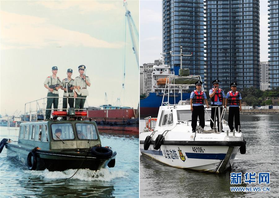 拼版照片:左图为上世纪80年代,原武警海南边防总队海口支队官兵在执行巡逻任务(资料照片);右图为2019年6月25日,海南省公安厅海岸警察总队(筹备组)海口支队民警在海口湾水域执行巡逻任务(新华社记者杨冠宇摄)。