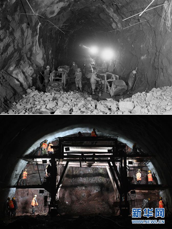 拼版照片:上图为1982年,铁道兵第八师指战员在引滦入津工程隧道施工中人工装运石渣;下图为2019年5月25日,中铁十八局集团有限公司(原铁道兵第八师)的建设者在玉磨铁路(玉溪至磨憨)大尖山隧道施工中用钻孔台车作业。