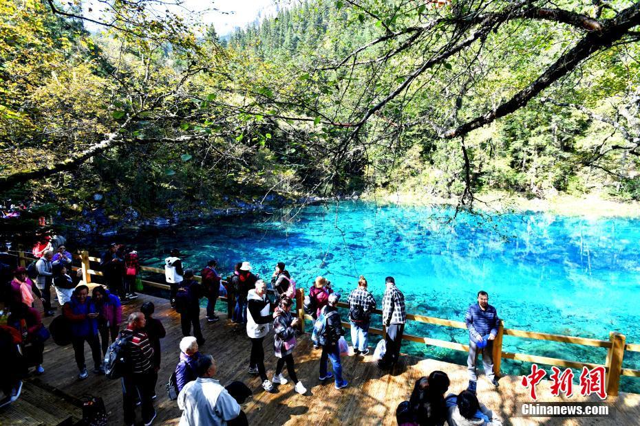 9月27日,四川九寨沟景区试开园迎来首批游客。九寨沟风景区经过两年灾后恢复重建,从即日起开始恢复接待团队游客,每日限流5000人。图为游客在五彩池景点参观。中新社记者 安源 摄