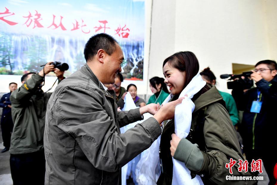 9月27日,四川九寨沟景区试开园迎来首批游客。九寨沟风景区经过两年灾后恢复重建,从即日起开始恢复接待团队游客,每日限流5000人。图为景区工作人员为第一位检票进入景区的游客献上哈达。中新社记者 安源 摄