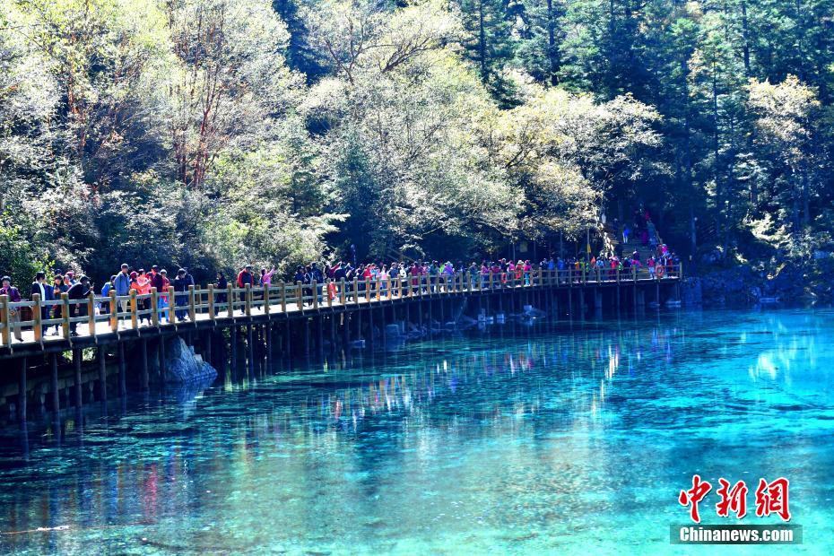 9月27日,四川九寨沟景区试开园迎来首批游客。九寨沟风景区经过两年灾后恢复重建,从即日起开始恢复接待团队游客,每日限流5000人。图为游客在五彩池景点参观。中新社记者 安源 摄