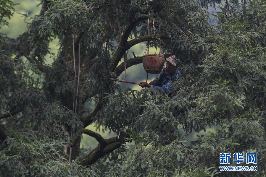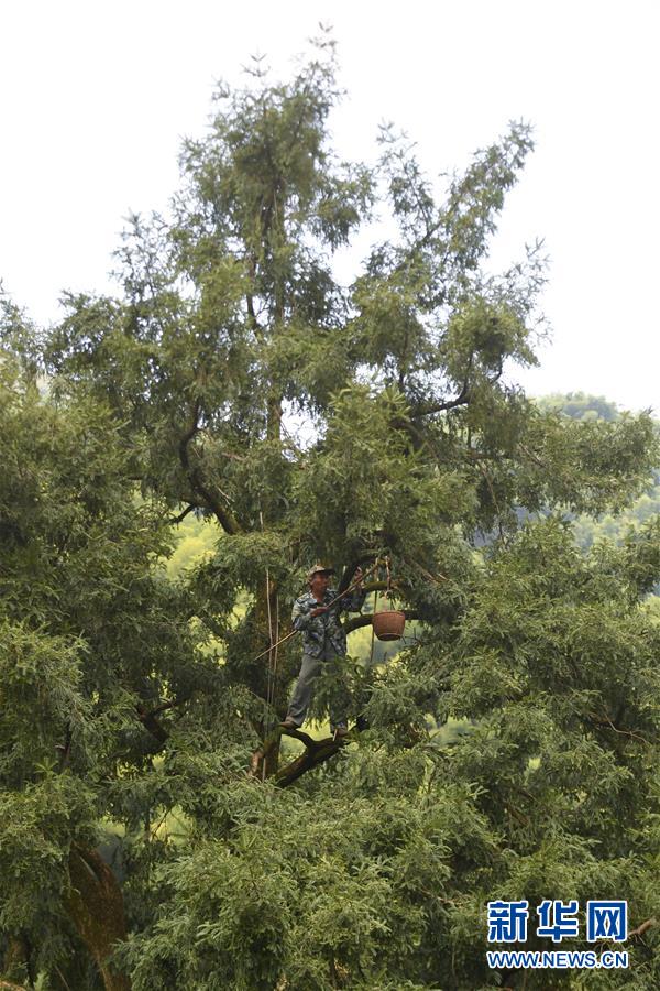 9月27日,绍兴市柯桥区稽东镇龙西村的村民在树上采摘香榧鲜果。 金秋时节,浙江省绍兴市柯桥区稽东镇的特色坚果香榧迎来丰收季。据了解,稽东镇是绍兴会稽山古香榧群的核心产区,现有香榧栽培面积5万亩,其中每年产出香榧干果约450吨,2018年产值超过1亿元。 新华社记者 黄宗治 摄