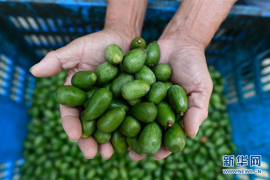 9月27日,绍兴市柯桥区稽东镇龙西村的村民展示刚采摘的香榧鲜果。 金秋时节,浙江省绍兴市柯桥区稽东镇的特色坚果香榧迎来丰收季。据了解,稽东镇是绍兴会稽山古香榧群的核心产区,现有香榧栽培面积5万亩,其中每年产出香榧干果约450吨,2018年产值超过1亿元。 新华社记者 黄宗治 摄