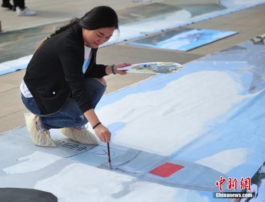 9月29日,沈阳航空航天大学开展“共诉爱国情,同绘强国梦”——师生绘画长卷献礼国庆主题活动。教师和学生们在一幅长35米、宽3.5米的长卷上,绘出了高铁、C919飞机、长城等画面。中新社记者 于海洋 摄