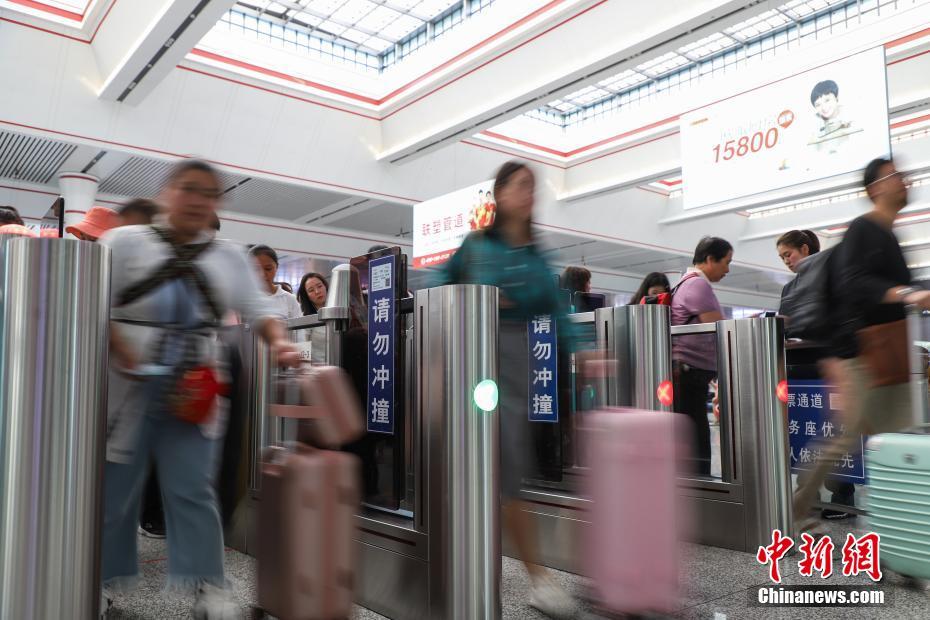 9月30日,乘客在贵阳北站候车大厅内检票进站。当日是国庆假期前一天,全国铁路迎来出行客流高峰。中新社记者 瞿宏伦 摄