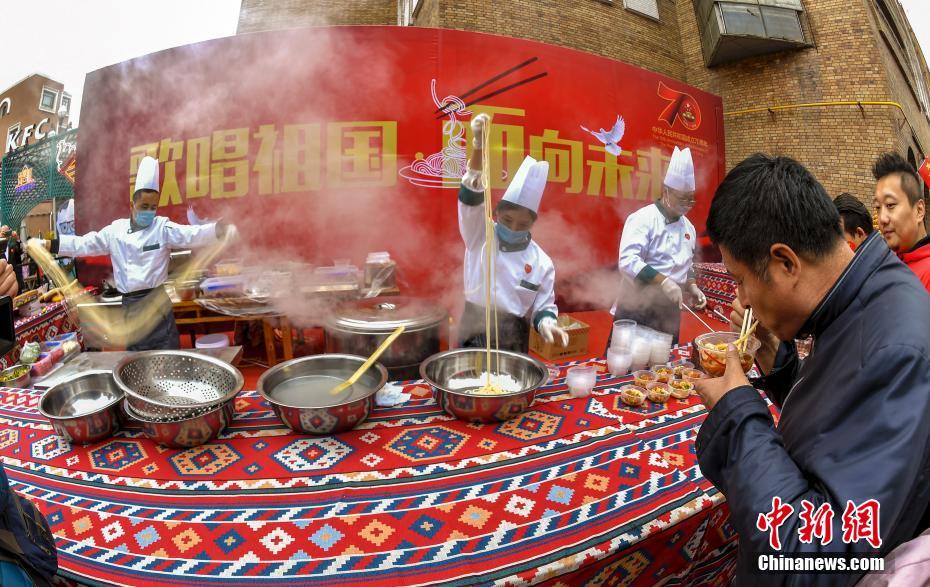10月1日,新疆乌鲁木齐市二道桥的国际大巴扎,举办同吃“国庆面”活动,700份新疆特色美食——新疆拌面,免费提供给游客和市民品尝,庆祝国庆节。当天,新疆多地举办形式多样的活动,庆祝中华人民共和国成立70周年。中新社记者 刘新 摄