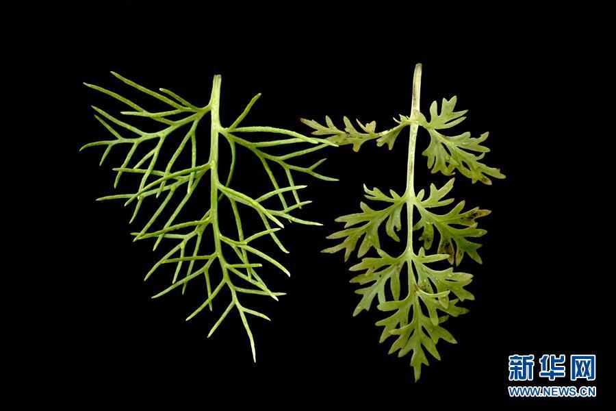 10月10日,在上海辰山植物园培养室里拍摄的粗梗水蕨孢子叶(左)和营养叶(右)。新华社记者 张建松 摄