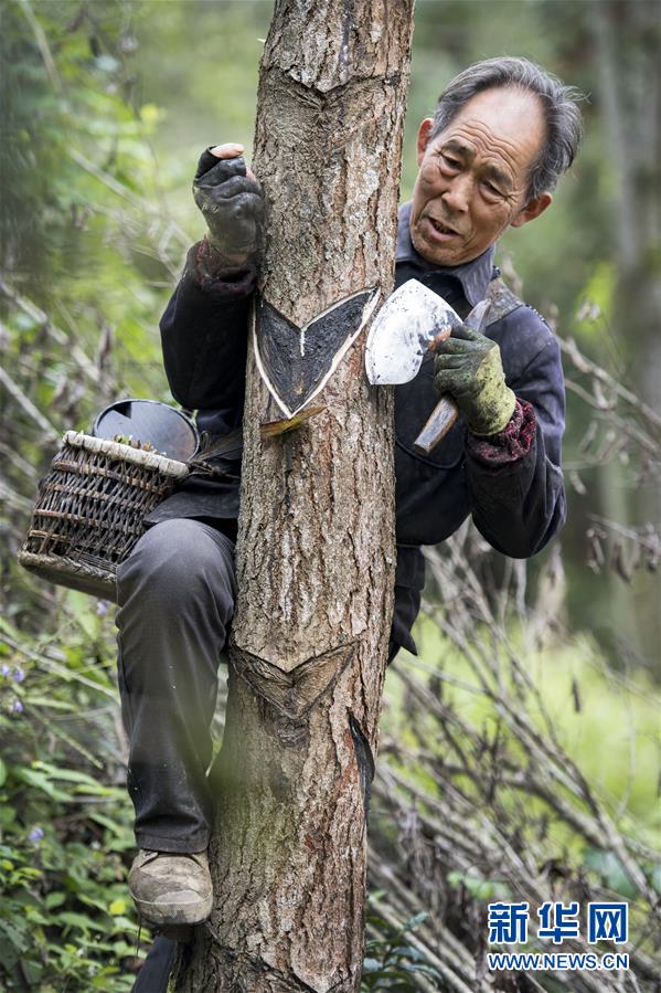 10月12日,陕西省岚皋县蔺河镇蒋家关村70岁的刘照元老人在高高的漆树上割生漆。 新华社记者陶明摄