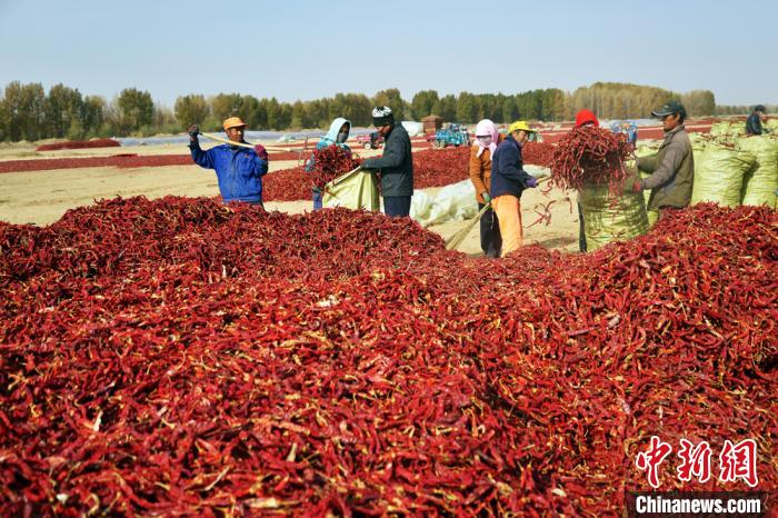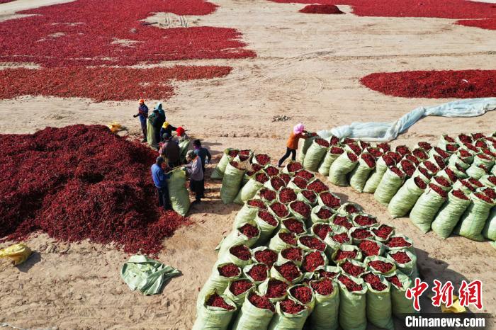 甘肃省张掖市高台县合黎镇八坝村戈壁滩上,一百余位民众将晾晒好的红辣椒进行打包、装车和拉运。