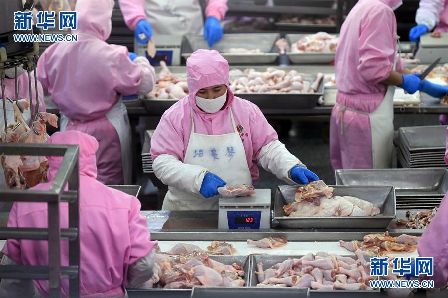 近年来,甘肃省镇原县全力打造肉鸡全产业链项目,先后建起孵化场、养殖场、屠宰厂、饲料厂等。今年以来,当地龙头企业甘肃中盛农牧发展有限公司积极与东部先进企业合作整合,对原有厂房和生产线进行升级改造,恢复并逐渐扩大产能,计划在三年内建成1.2亿羽肉鸡全产业链项目。截至目前,19个肉鸡养殖场今年共投放白羽肉鸡鸡苗1681万羽,肉鸡加工厂日屠宰量达9万只,肉鸡全产业链项目相关产业吸收近2000名本地员工上岗就业。 新华社记者 马宁 摄