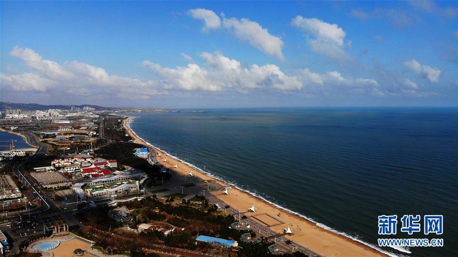 11月22日无人机拍摄的日照市万平口海滨风景区。 山东省日照市万平口海滨风景区是当地旅游的一张“名片”,该景区凭借优美的海滩、良好的水质吸引了不少游客。 新华社记者 王凯 摄