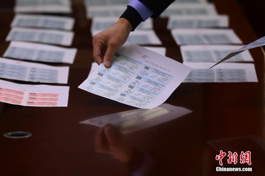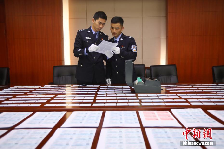 12月23日,南京铁路公安处民警清点缴获的假火车票。近日,南京铁路警方连续捣毁了两处制贩假票窝点,抓获制售假票违法犯罪嫌疑人两名,现场缴获1000余张假火车票以及台式电脑、打印机等作案工具。中新社记者 泱波 摄