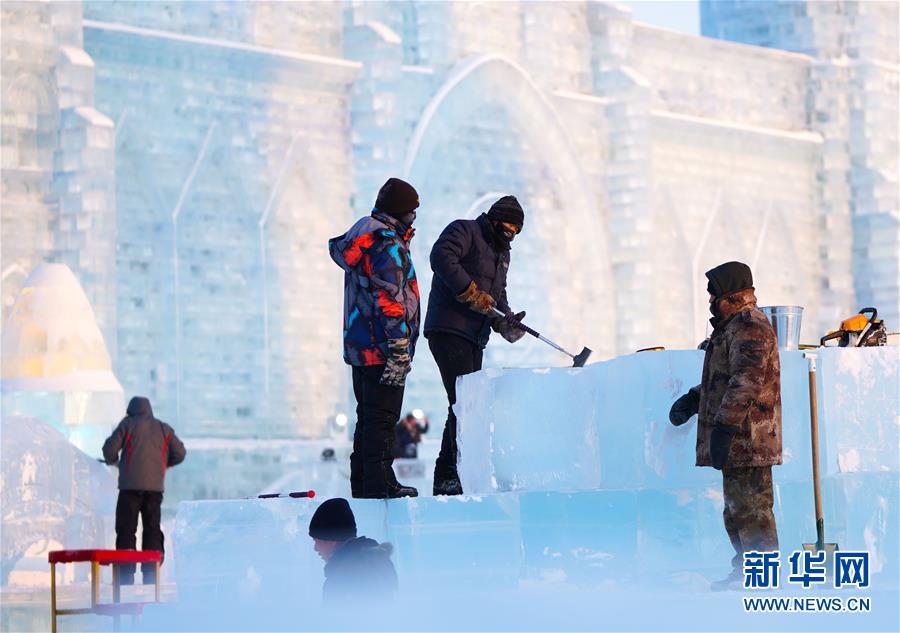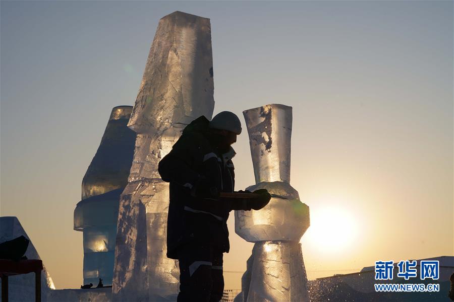 12月31日,选手在第9届中国·哈尔滨国际组合冰雕比赛中进行冰雕创作。新华社记者 王松 摄