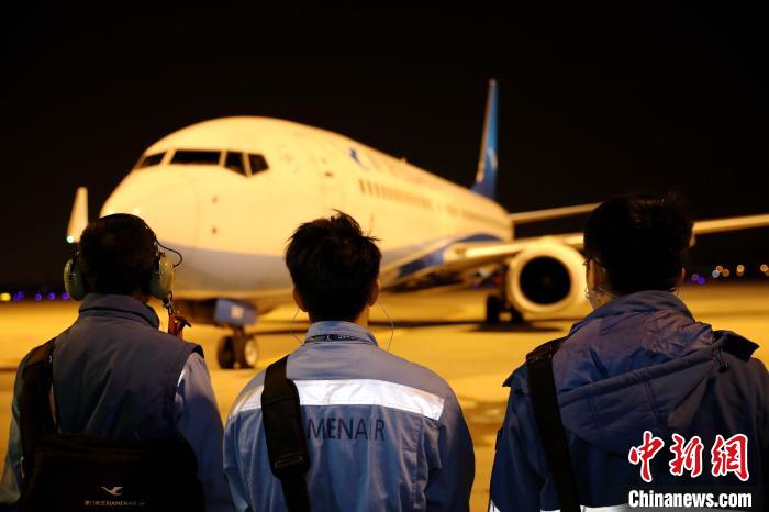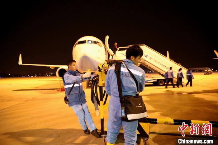 12月31日晚23:51分,由大连中转杭州的MF8080航班安全降落厦门高崎机场,标志着厦门航空2019年生产任务完成。飞机停靠至指定位置后,在辞旧迎新之际,一旁等待的身穿蓝色制服的航线机务人员顶着寒风来到宽阔的停机坪上,伴着超过100分贝的轰鸣声,上前检查起落架情况并进行固定,绕着飞机重复进行多项例行检查,确保旅客平安跨年。