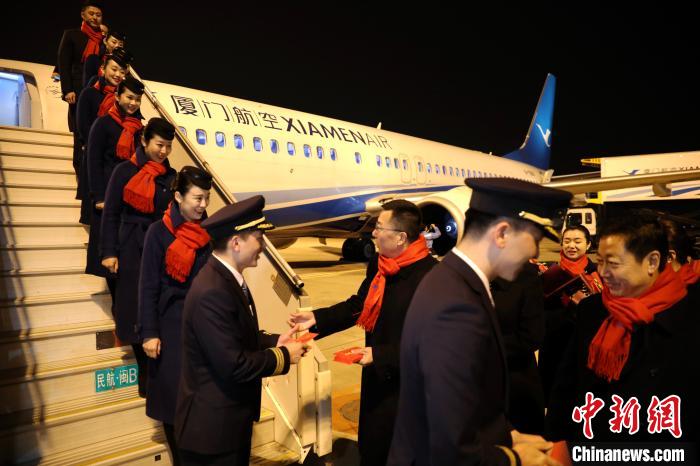 图为厦门航空公司董事长赵东一行迎接机组。 李思源 摄