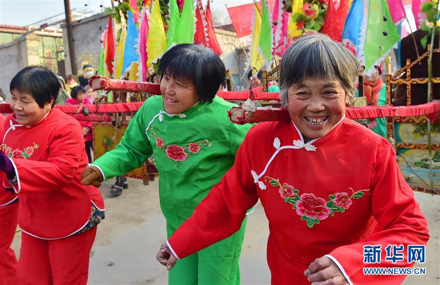 1月2日,河北石家庄市赞皇县陈村的村民在表演“抬皇杠”。新华社发(张晓峰 摄)