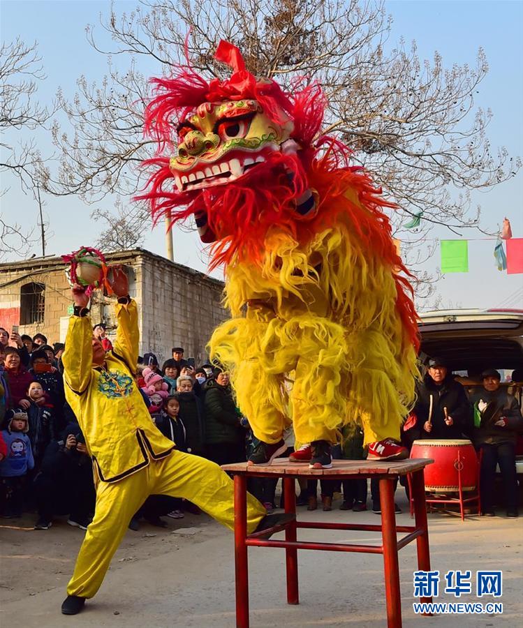 1月2日,石家庄市赞皇县陈村的村民在表演舞狮。新华社发(张晓峰 摄)
